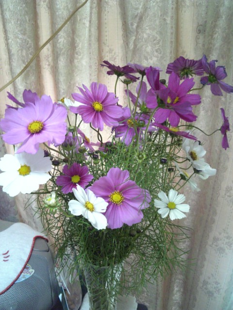 ふとした身近なことばかりですが、「日記みたいなもの」ですのでいいですよね(^_^;) 床につく回数も減り、少しずつ仕事も出来るようになりました(←家業) まあ…出来ることからコツコツとやってまいります(^^;) 何か「逆転」情報が多くなってきてから調子がいいんですよね。 すごいぞ、なるほどくん! 御剣さん! 元気をありがとーっっ(笑) さて。今、もう一つの元気。植物。 ご近所さんからコスモスをいただきましたw (ついでに野菜も/笑) コスモスは私の好きな花のベスト10に入っている花です。 私の通っていた小学校にたくさん咲いてたので、思い出のある植物です。 ……う~ん、懐かしいっ。 綺麗だったので、アップしてみました。写真がヘタなのはご愛嬌ということで…(^_^;) ・・・・・・・・・・・・・・・・・★ 11/3 拍手をありがとうございましたww 押していただけるだけで、本当に嬉しく、励まされます。 また、遊びにいらしてくださいませ(^▽^)/